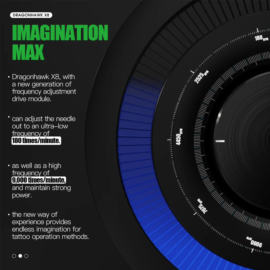 Introducing the Dragonhawk X8, our first-ever wireless tattoo pen with adjustable frequency, designed to meet the needs of modern tattoo artists. This advanced machine not only offers precise control over speed and power but also remembers your favorite settings—up to five custom speed, power, and working time configurations. Whether you’re creating fine details or bold outlines, the Dragonhawk X8 unlocks endless creative possibilities.