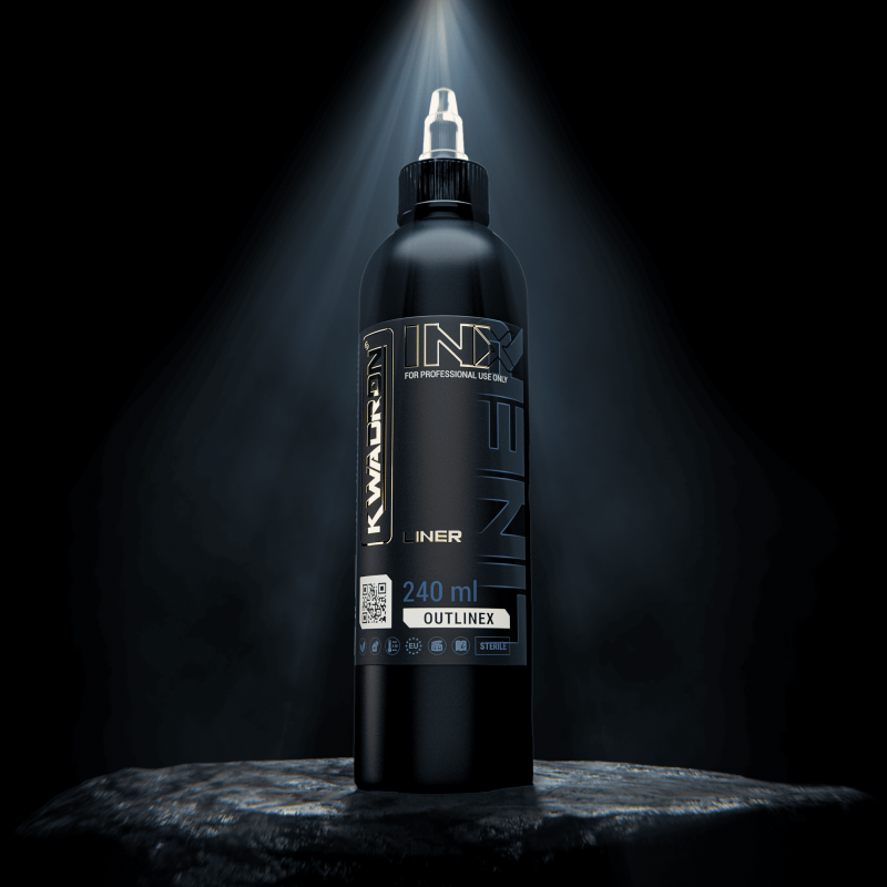 Kwadron INX™ Outlinex 8oz/240ml is a premium black tattoo ink designed for artists who demand precision, smoothness, and consistent results. Engineered for long lines and fine details, it delivers an even, intense black from the first stroke to the last, allowing tattooists to focus entirely on their art.